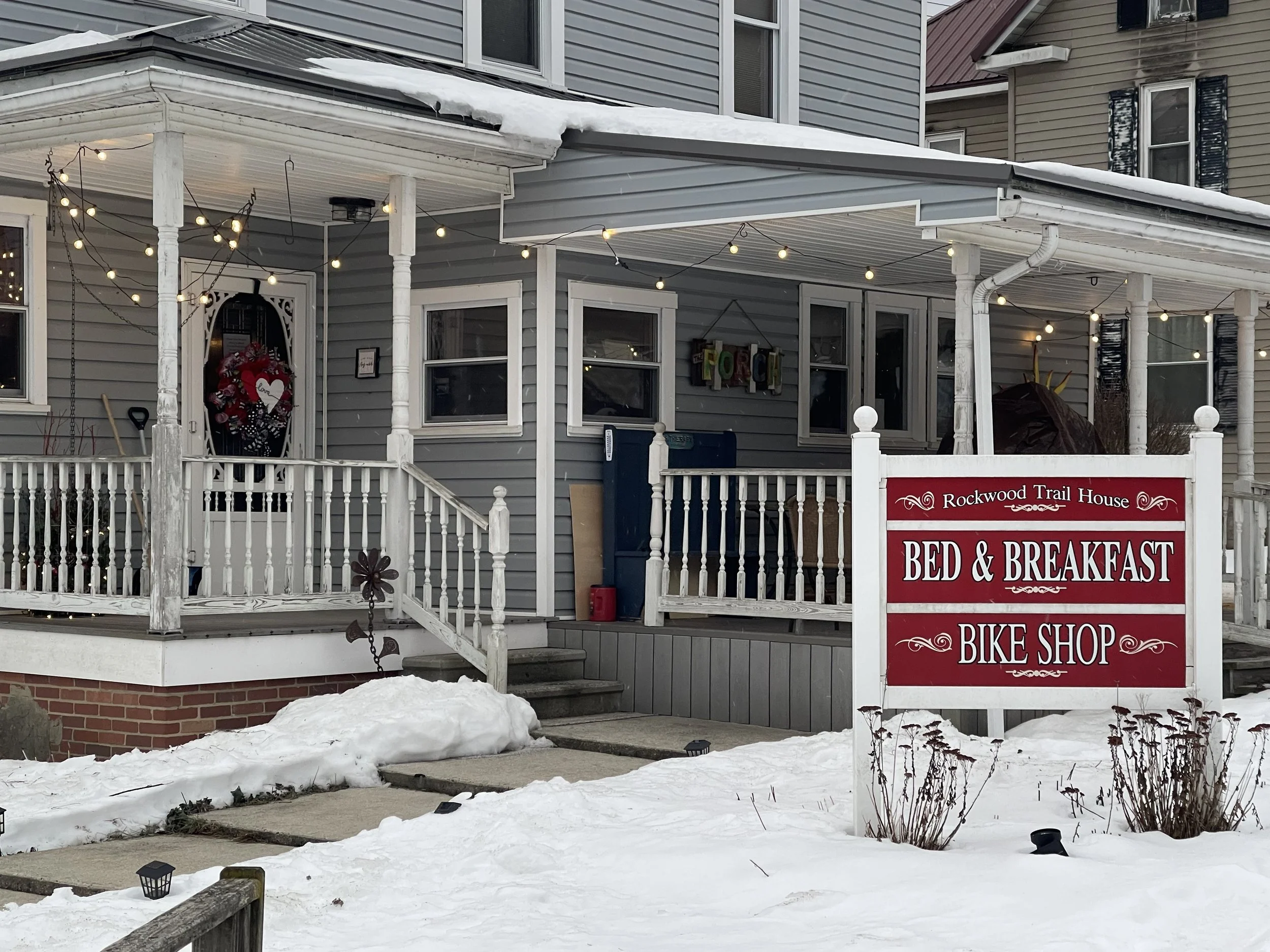 We had a fabulous stay at the Rockwood Trailhouse. The rooms were clean and comfortable. Ours had a private bath. Kitchen was very well-stocked for breakfast. The common room and porch were both very nice. April thought of everything - locks, bike covers, pump, access to laundry. Everything was perfect for cyclists.